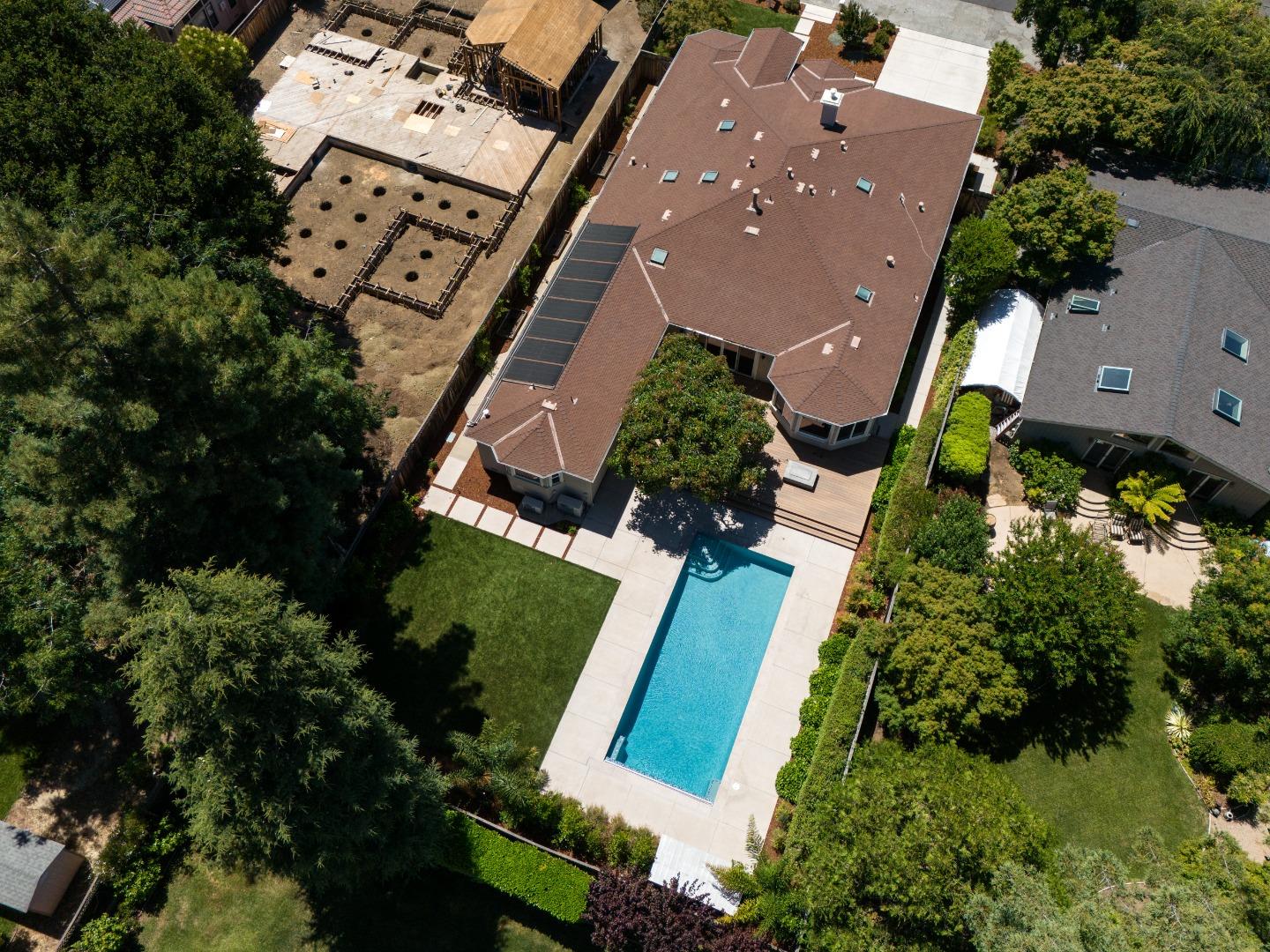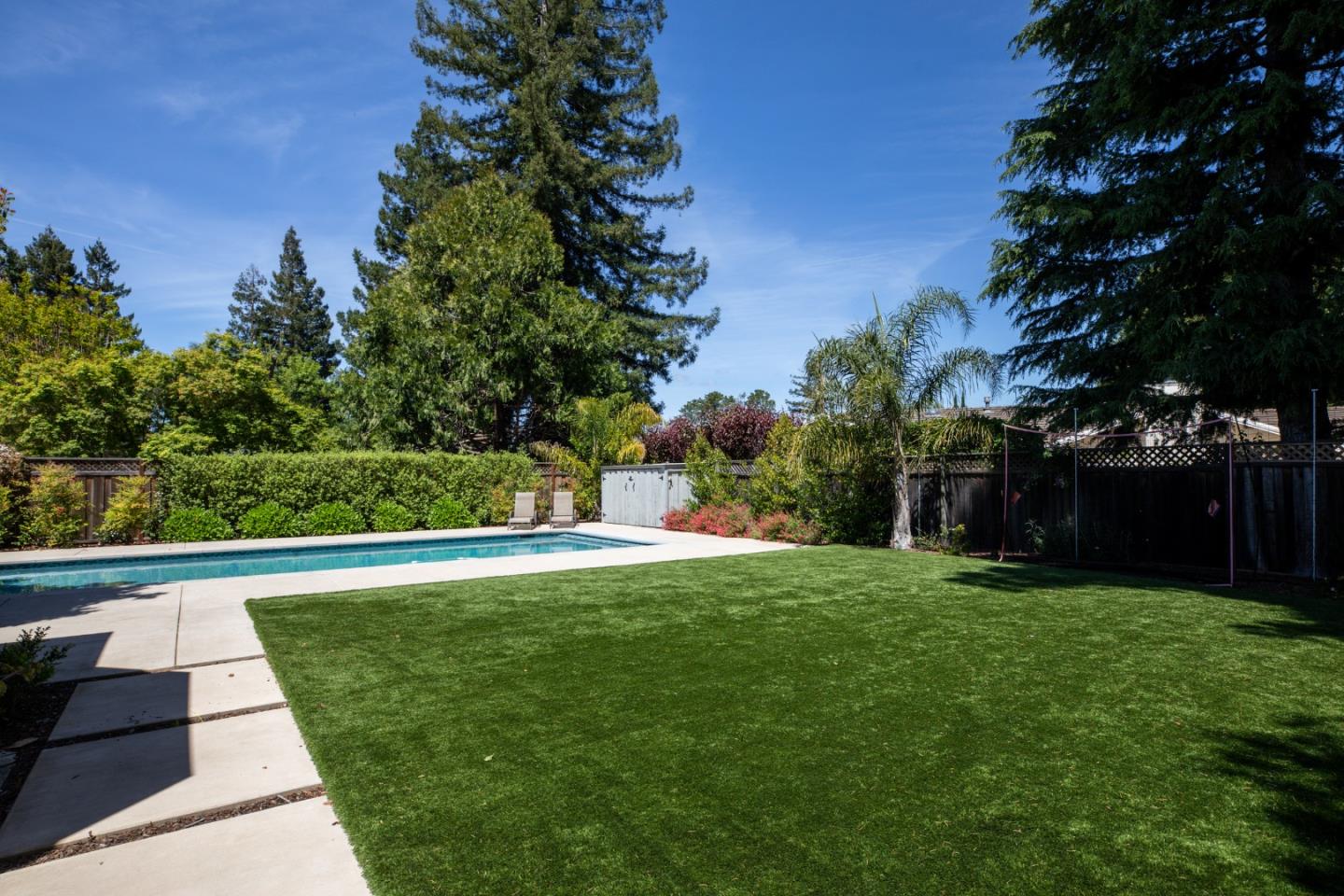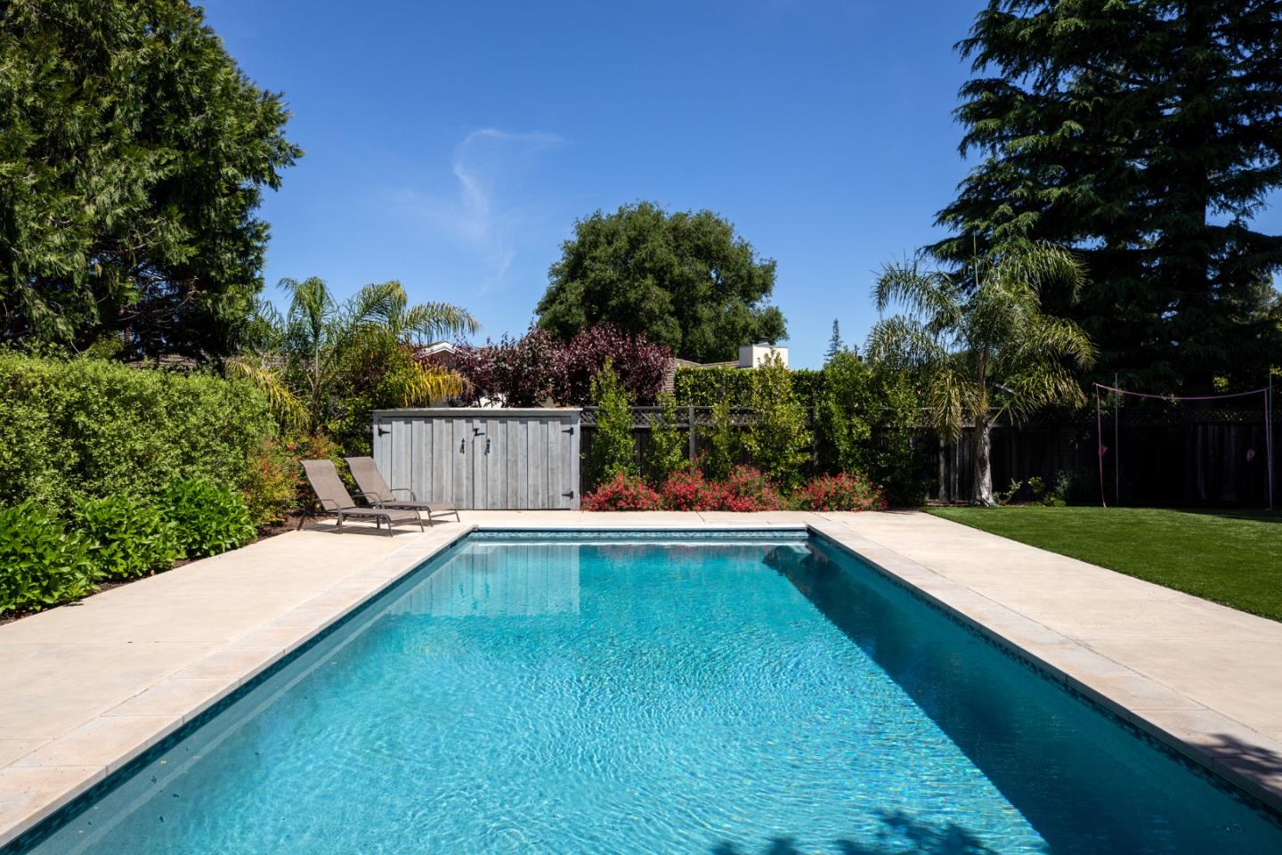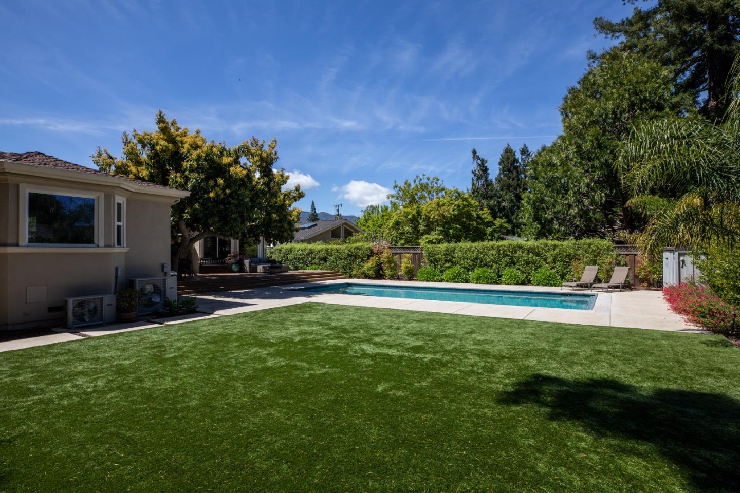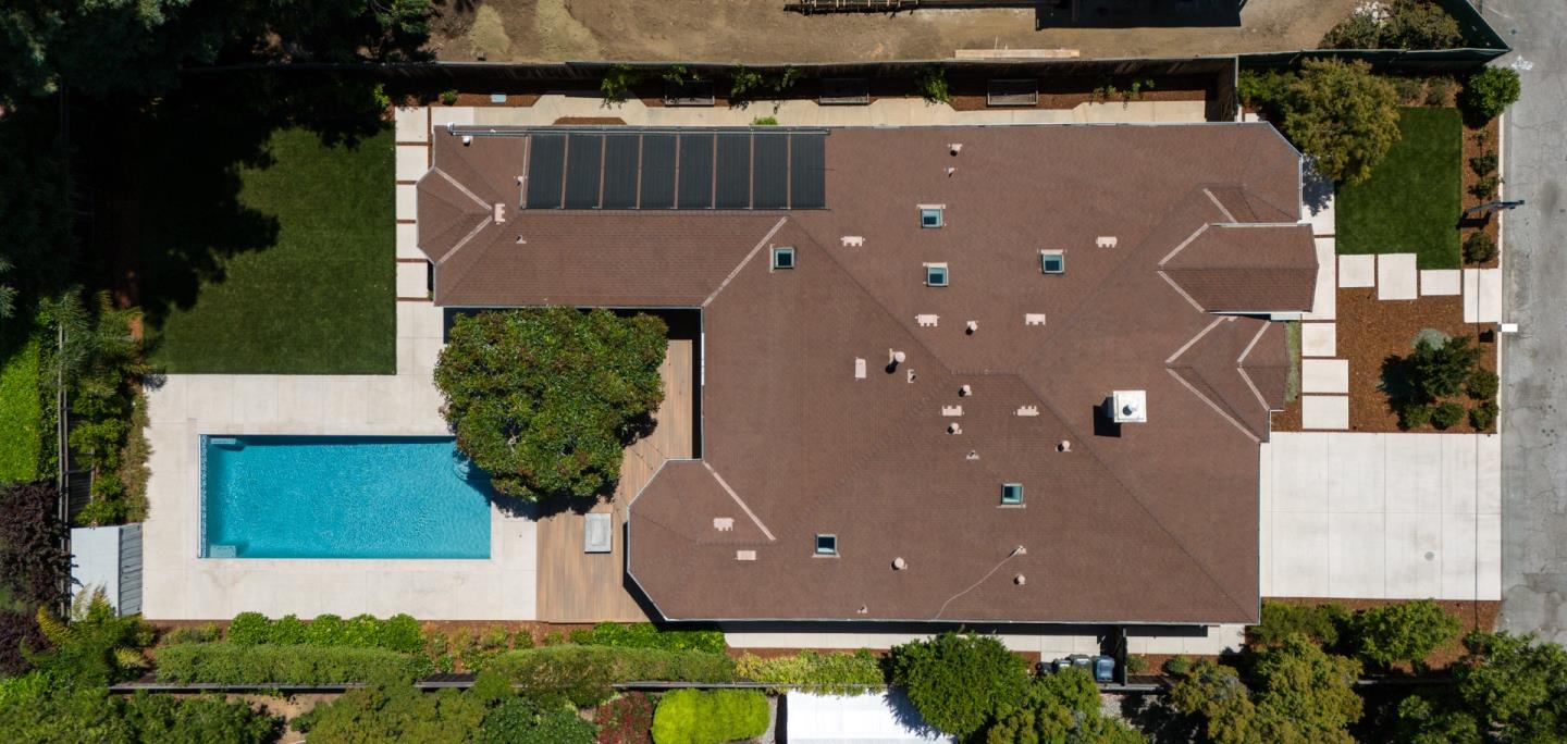 Nestled in Los Altos on a quiet cul-de-sac, this modern 4-bed, 3.5-bath +/-3597 SF at 955 Stanley Avenue offers luxury on +/-12432 sqft lot. High ceilings throughout this home. Large office with built in desk and bookshelves views the front grounds offers abundant light, perfect for at home work. Skylights illuminate the living and dining areas, complemented by a chef's kitchen and butler's pantry. There is an eat in area off of the kitchen with soaring bay window that views the rear grounds. The kitchen also opens to a large family room with fireplace. The primary suite features a spa-like bathroom and walk-in closet. A spacious backyard with pool, soccer field type grass area, recently replaced with artificial turf, raised beds, and alfresco dining area add to the charm and perfect California living. With laundry room, garage, and AC, this home seamlessly blends luxury and functionality. Experience convenience and sophistication in the heart of Los Altos.