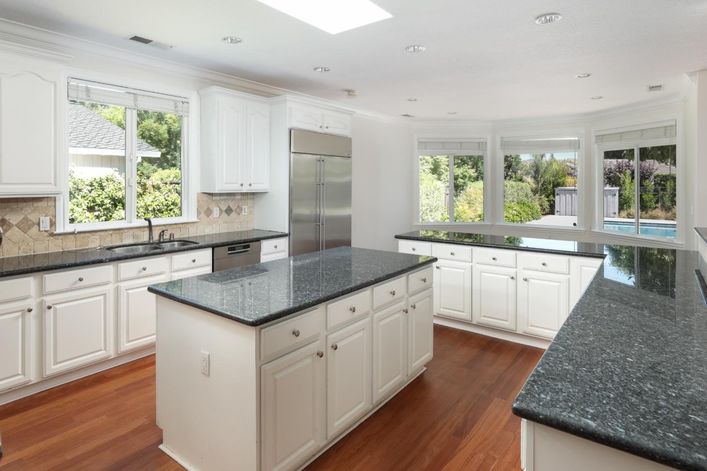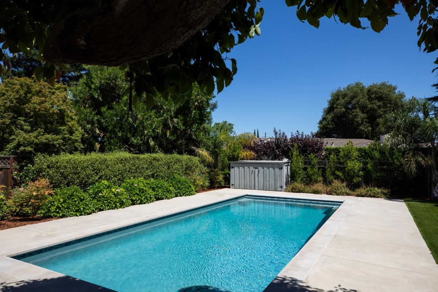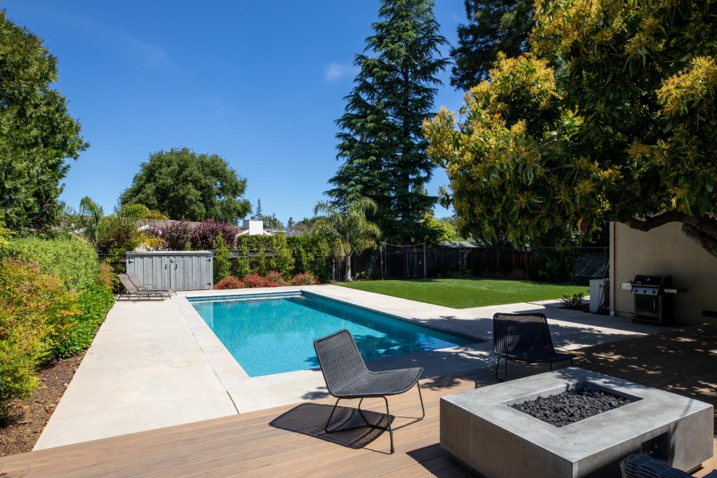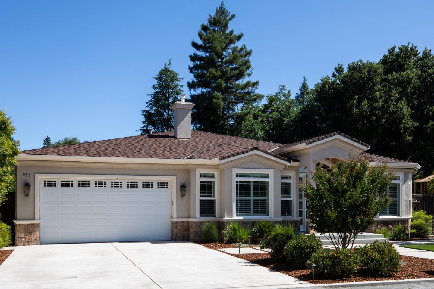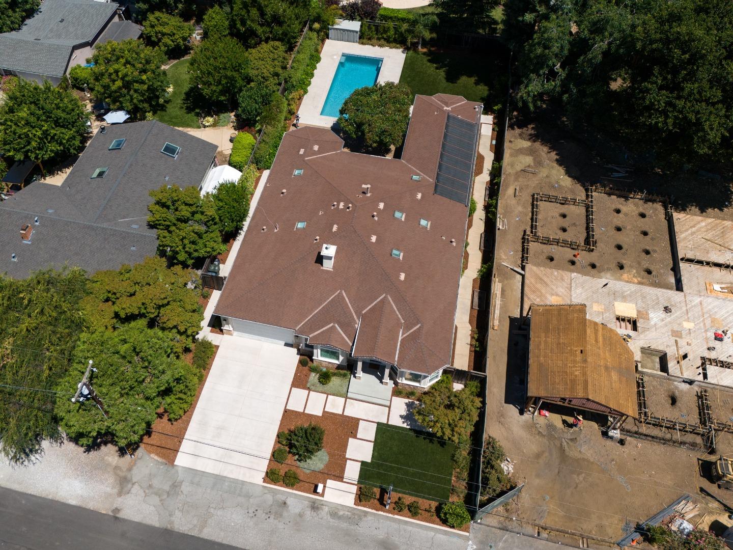 Nestled in Los Altos on a quiet cul-de-sac, this modern 4-bed, 3.5-bath +/-3597 SF at 955 Stanley Avenue offers luxury on +/-12432 sqft lot. High ceilings throughout this home. Large office with built in desk and bookshelves views the front grounds offers abundant light, perfect for at home work. Skylights illuminate the living and dining areas, complemented by a chef's kitchen and butler's pantry. There is an eat in area off of the kitchen with soaring bay window that views the rear grounds. The kitchen also opens to a large family room with fireplace. The primary suite features a spa-like bathroom and walk-in closet. A spacious backyard with pool, soccer field type grass area, recently replaced with artificial turf, raised beds, and alfresco dining area add to the charm and perfect California living. With laundry room, garage, and AC, this home seamlessly blends luxury and functionality. Experience convenience and sophistication in the heart of Los Altos.